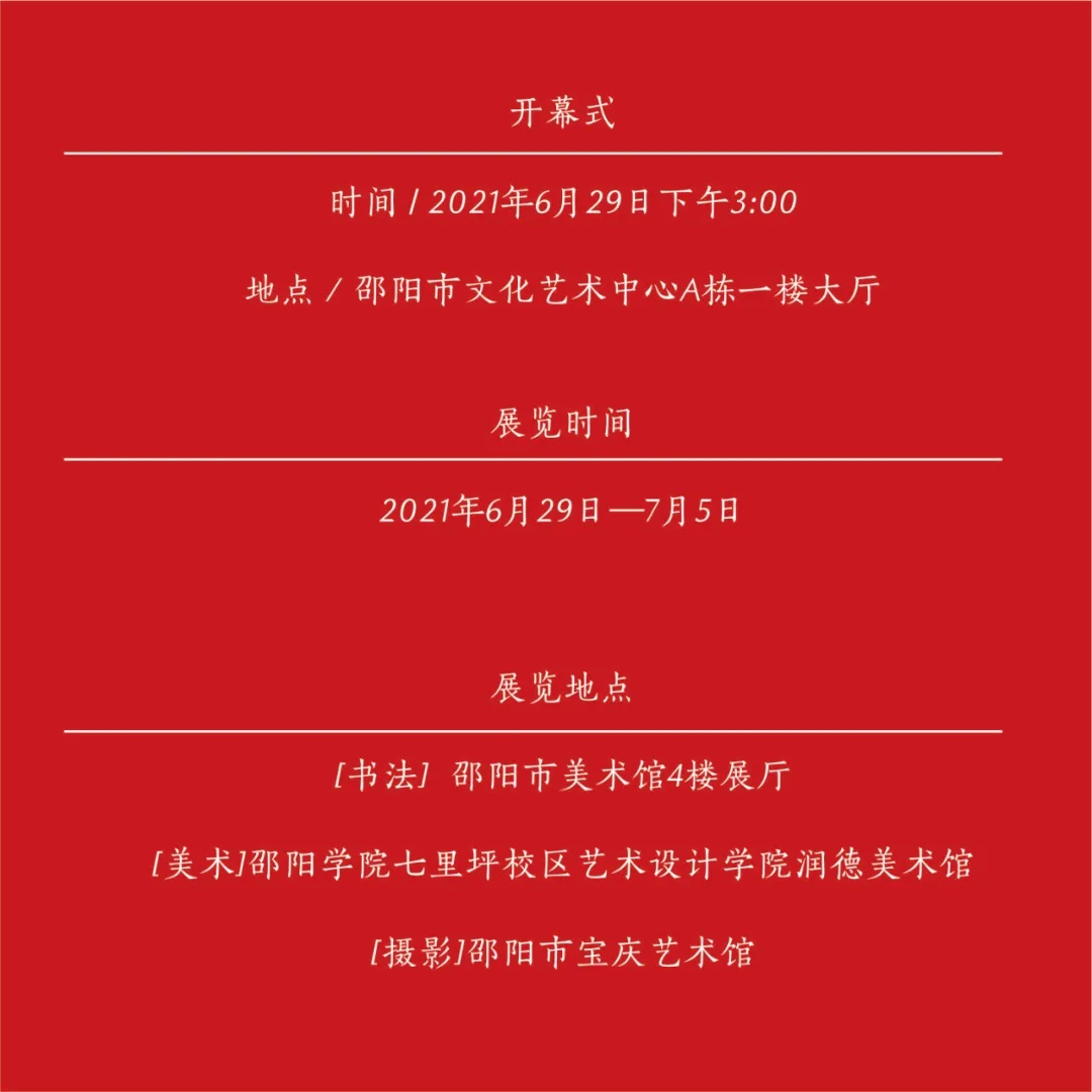 大(dà)展預告 ▏ 鴻圖 · 慶祝建黨100周年(nián)邵陽市(shì)σ§×書(shū)法美(měi)術(shù)攝影(yǐng)作(zuò)品&≤展
